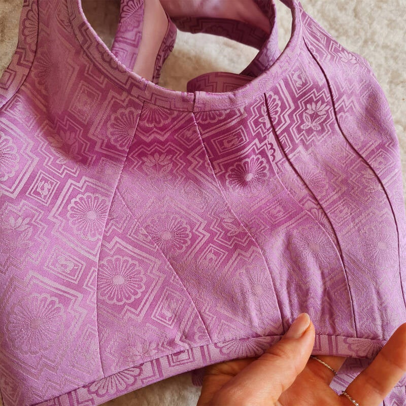 Internal: Lightly structured to maintain the drape of the kimono silk; designed to honor the natural body through precise tailoring rather than rigid force.