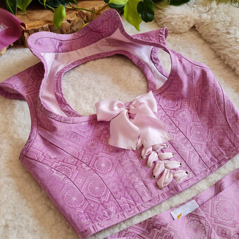 Shell: Antique kimono silk; a vibrant fuchsia ground etched with precise, geometric florals.