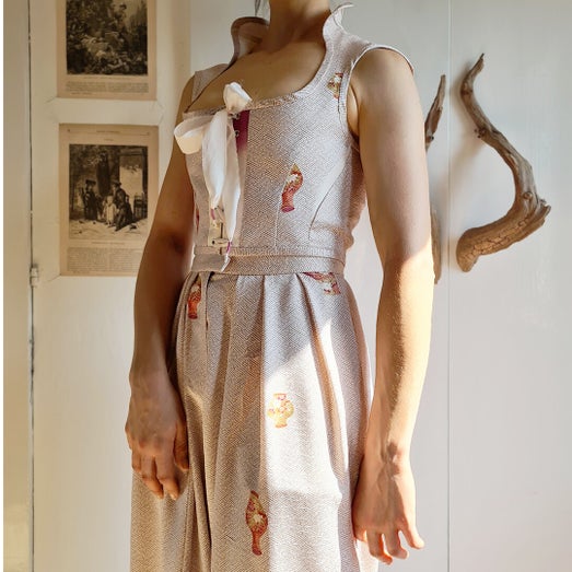 Made from an antique silk kimono — both shell and lining — this matching corset and pleated trouser set is a spell in textile form. The soft ivory-pink herringbone holds within it scattered vases — vessels of history, story, beauty. The corset features Fae Skin’s signature cutout back, framed by a standing collar and gentle swoops of silk ribbon, while the trousers flow wide with deep pleats and hand-dyed ombré hems that fade into violet dusk.