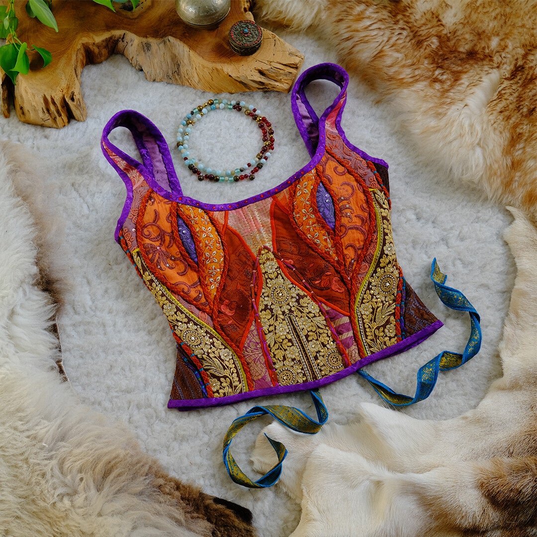 Vibrant, rich, and unapologetically alive — Ember Oracle is for those who divine their path through fire. Her panels ripple like flame in orange, crimson, and gold, edged in regal purple and finished with sapphire ribbon ties. Each brocade thread tells a story of ancient royalty, phoenixes, and sunlit temples. Wear her when you’re ready to be seen, truly and completely.