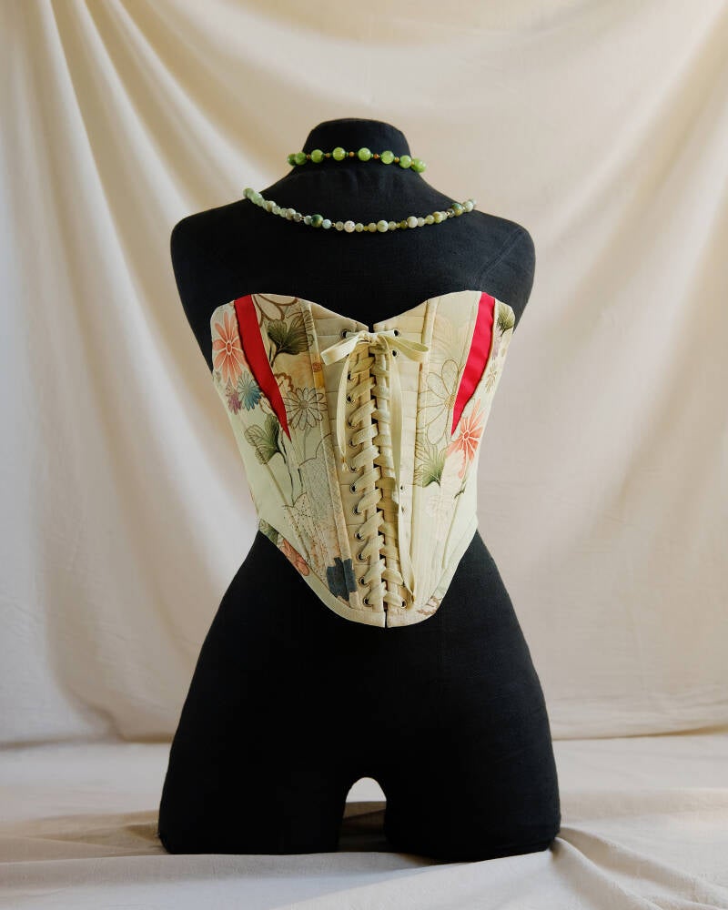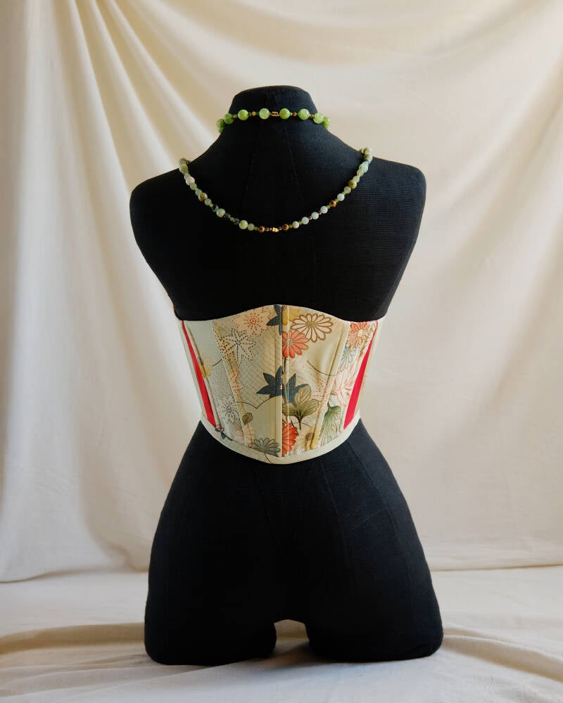 Whispers of sakura, dawn mist, and soft-spoken strength come together in Blossom Whisper. Handcrafted from repurposed silk, her petals bloom in delicate florals across a pale backdrop, framed by bold crimson linings — like a secret heart revealed. She laces up the front, shaping the body with ease and intention. A corset for dreamers who walk lightly but love deeply.