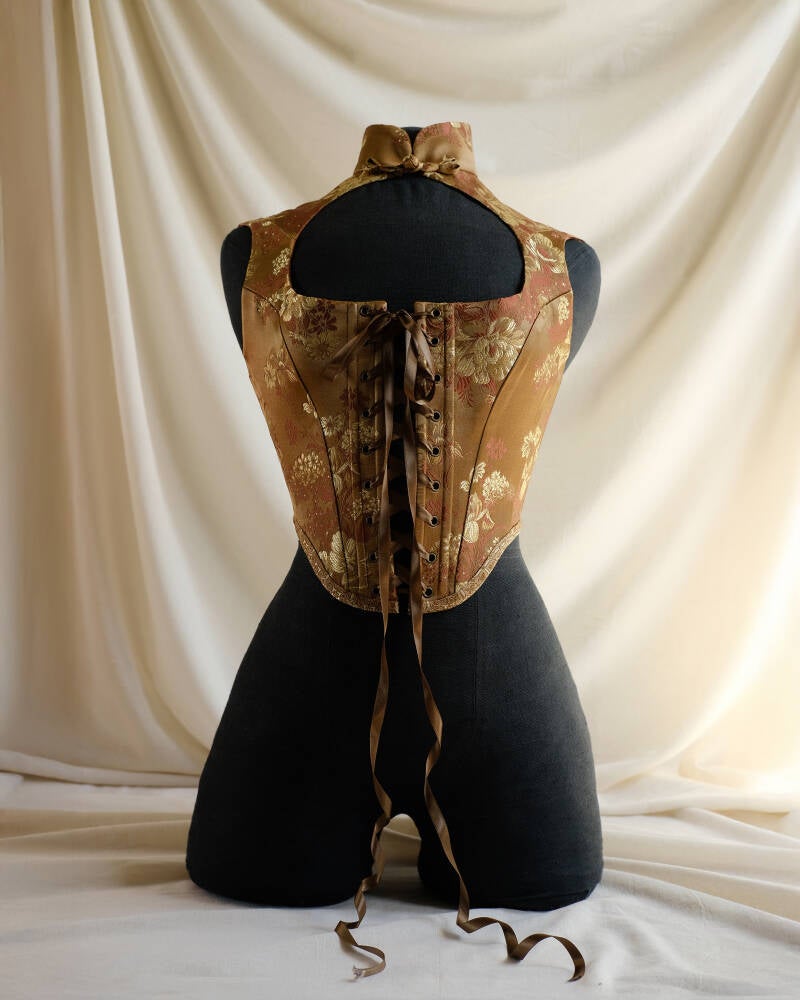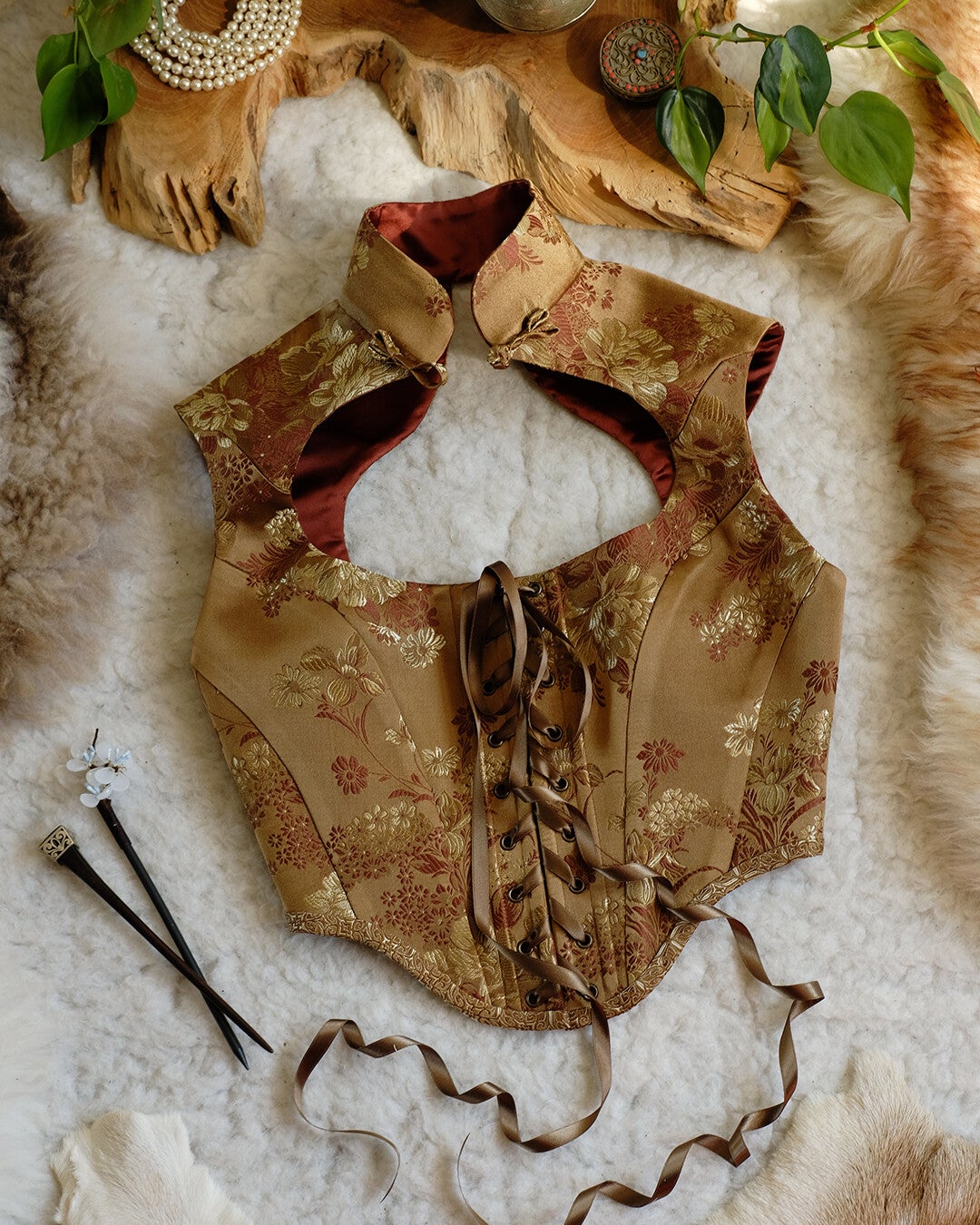 The Duskhoney corset blends soft structure and high romance in golden brown brocade. Her high Mandarin collar and sculpted neckline frame the shoulders and décolleté, while the keyhole back draws the eye like a whispered invitation. Lace-up closure allows for a perfect fit.