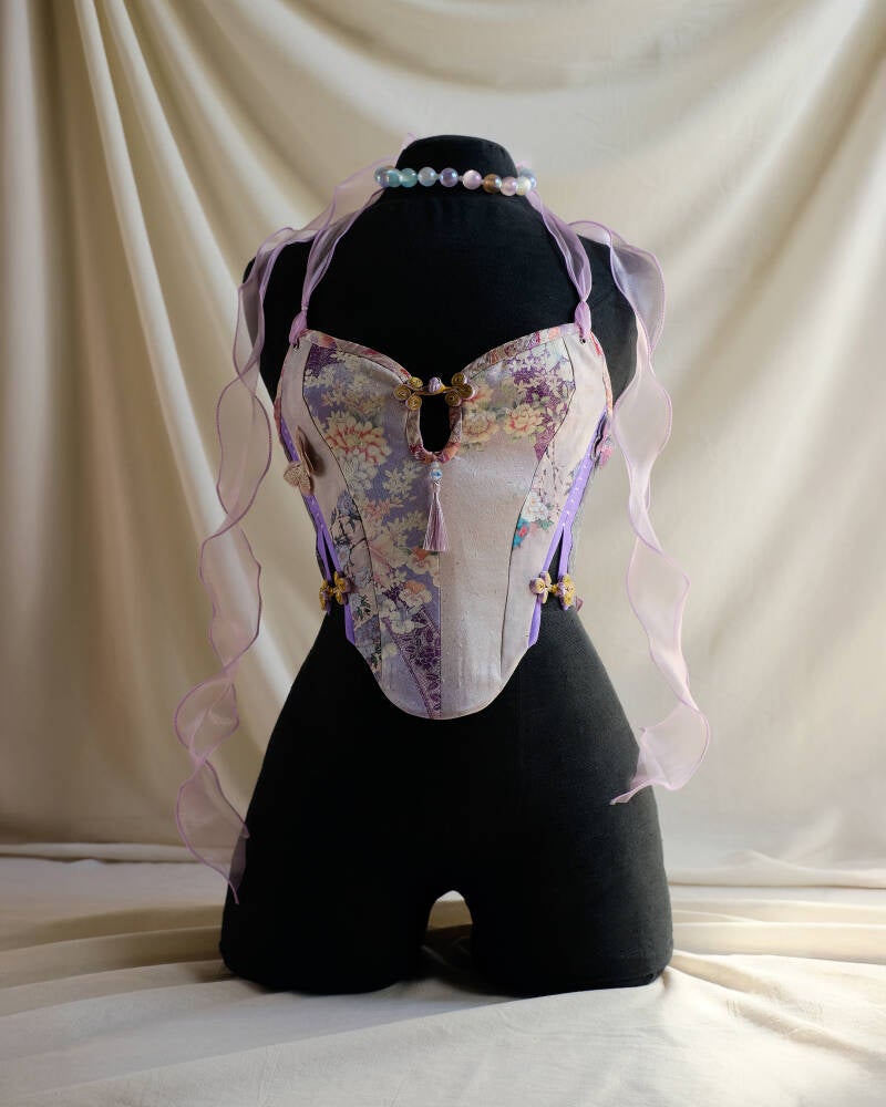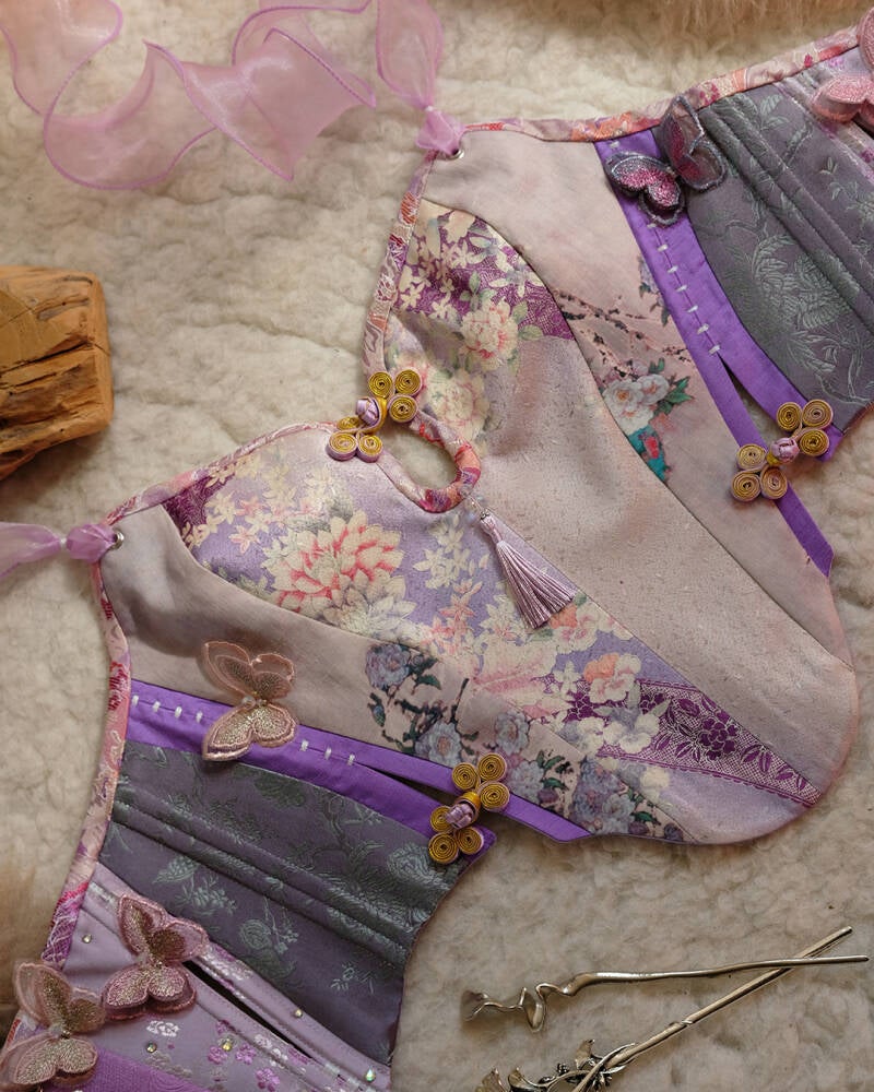 Crafted with a vintage kimono front and softened by scraps of silk and ramie gathered over time. She holds the waist softly while allowing for ease and breath, tied at the neck and back with lilac organza ribbons that dance in motion. Iridescent butterflies perch along her panels like fleeting thoughts, catching the light just so. Light and detailed, she carries the feeling of something once dreamed and almost forgotten — until you wear her.
