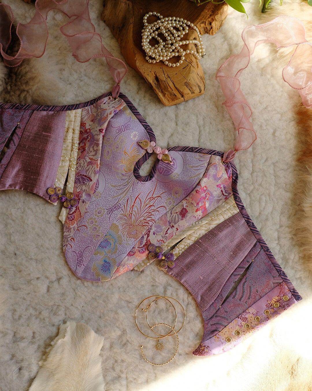 A corset kissed by the hush of spring twilight, Wisteria Mist sings in dusky lavenders and soft pearlescent light. Adorned with floral brocade and delicate butterflies that seem to rest mid-flight. Her gentle curves are framed by pastel-pink organza ties, adding an airy softness to her regal silhouette. The open keyhole at the front, trimmed with golden knotwork, draws the eye with quiet allure. Each detail is meant to enchant—from the sculpted cups that cradle the heart, to the blooming motifs that echo wild gardens and gentle spells.