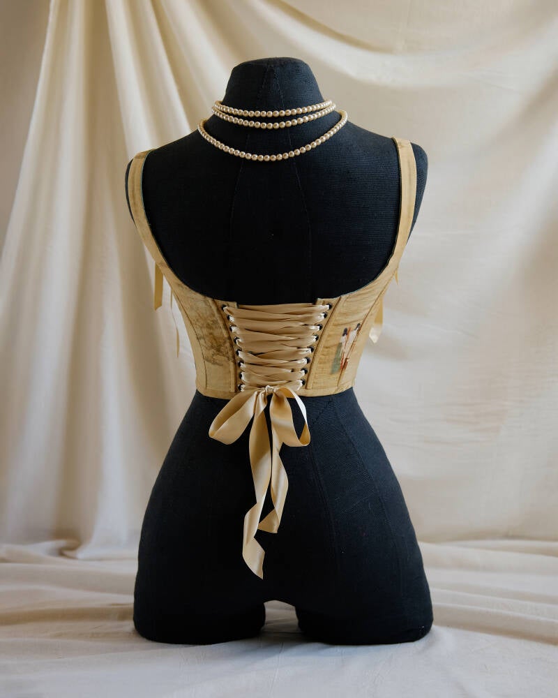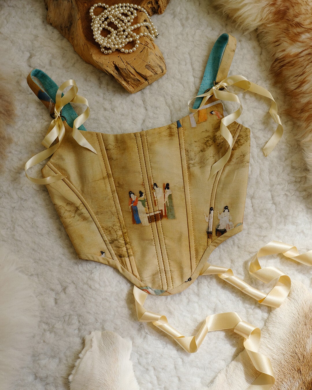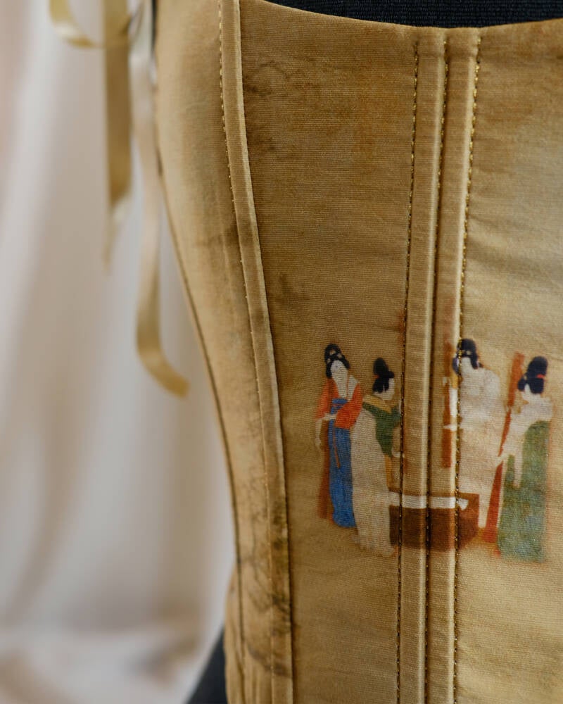 A one-of-a-kind corset crafted from a piece of dyed ramie, kissed in muted ochre tones. The painted tableau—evoking ancient stories, rituals, and silk road exchanges—is framed by expertly shaped panels that sculpt the form in graceful balance. Wide golden ribbons tie at the shoulders and back, offering both adjustability and a quiet luxury.