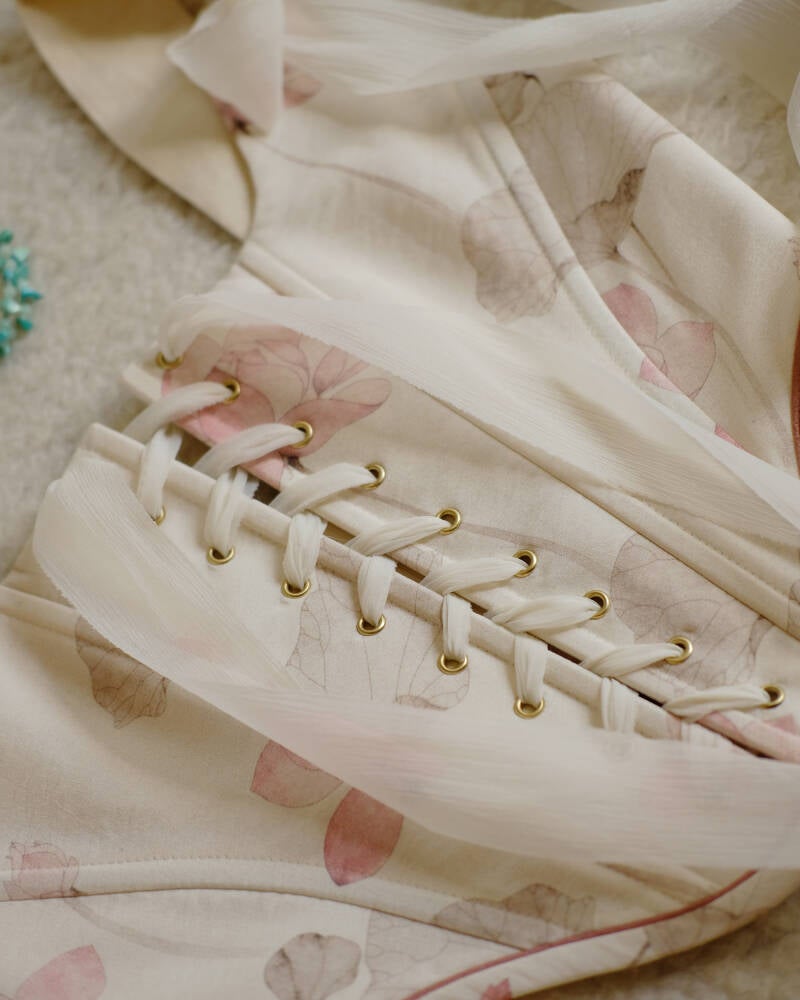 Lotus Mirth is a corset as light as dawn on water. Soft ivory ramie cradles an ethereal print of lotus blossoms and fine lines, whispering of still ponds and joy untamed. Flowing ribbons in sheer white tie at the shoulders and back, their movement echoing water reeds in the breeze. The sharply tapered back hem adds a touch of drama — a flick of mirth, a petal falling just so.