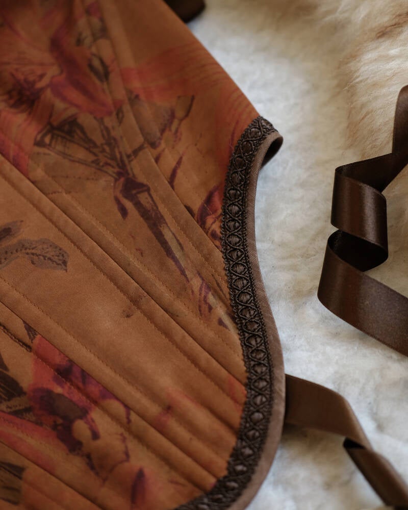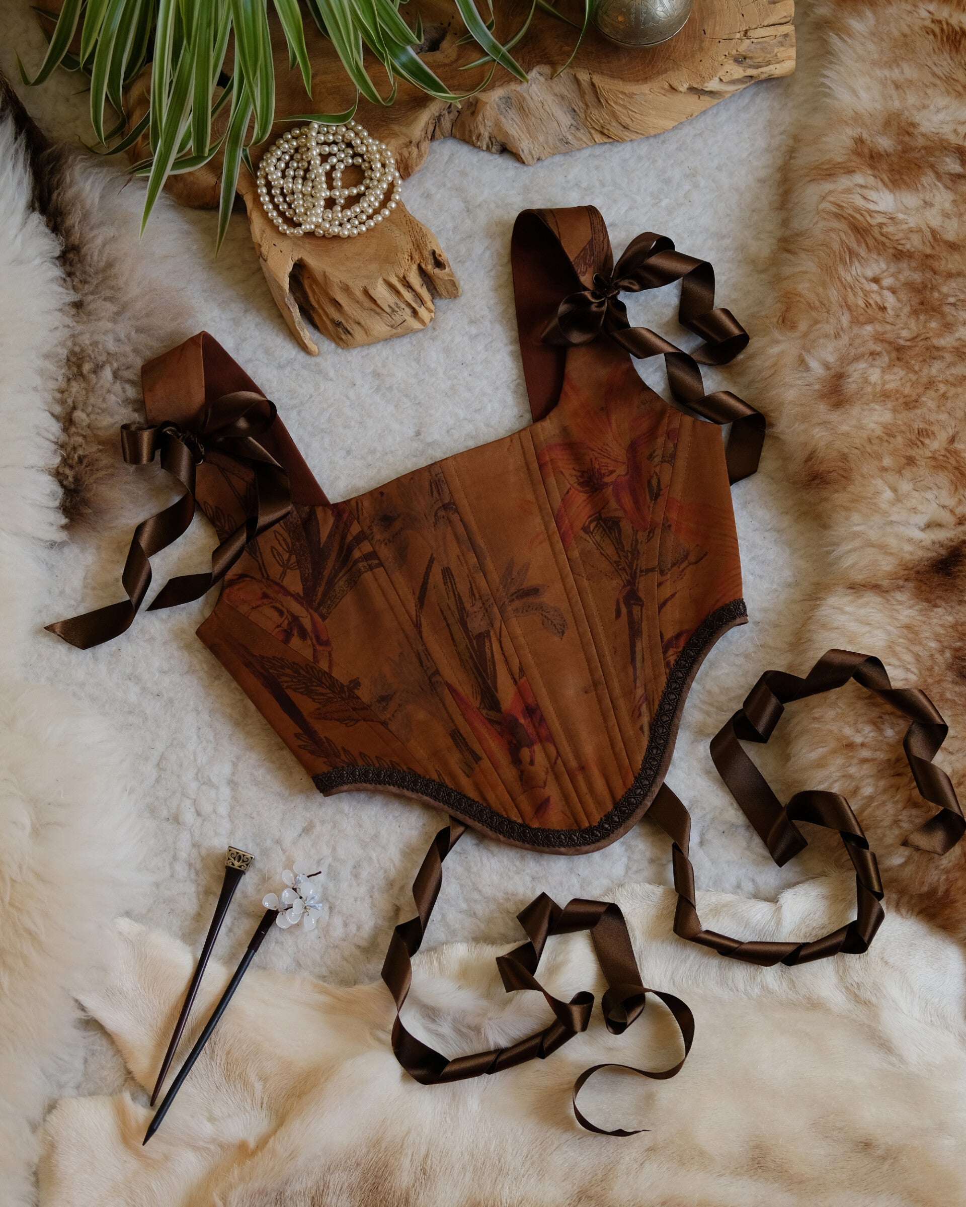 Marrowroot is a corset steeped in shadow and warmth. Crafted from a weighty, earthy brown silk with painterly floral markings in plum and ember, she evokes a wild bulb flowering beneath the forest floor. Smooth chocolate ribbons tie at the shoulders and back, while braided trim accents the hem in dark bronze. The shape is secure and sensual, with a deep scoop at the back and a gentle curve at the waist — structured enough to hold, soft enough to move with you.