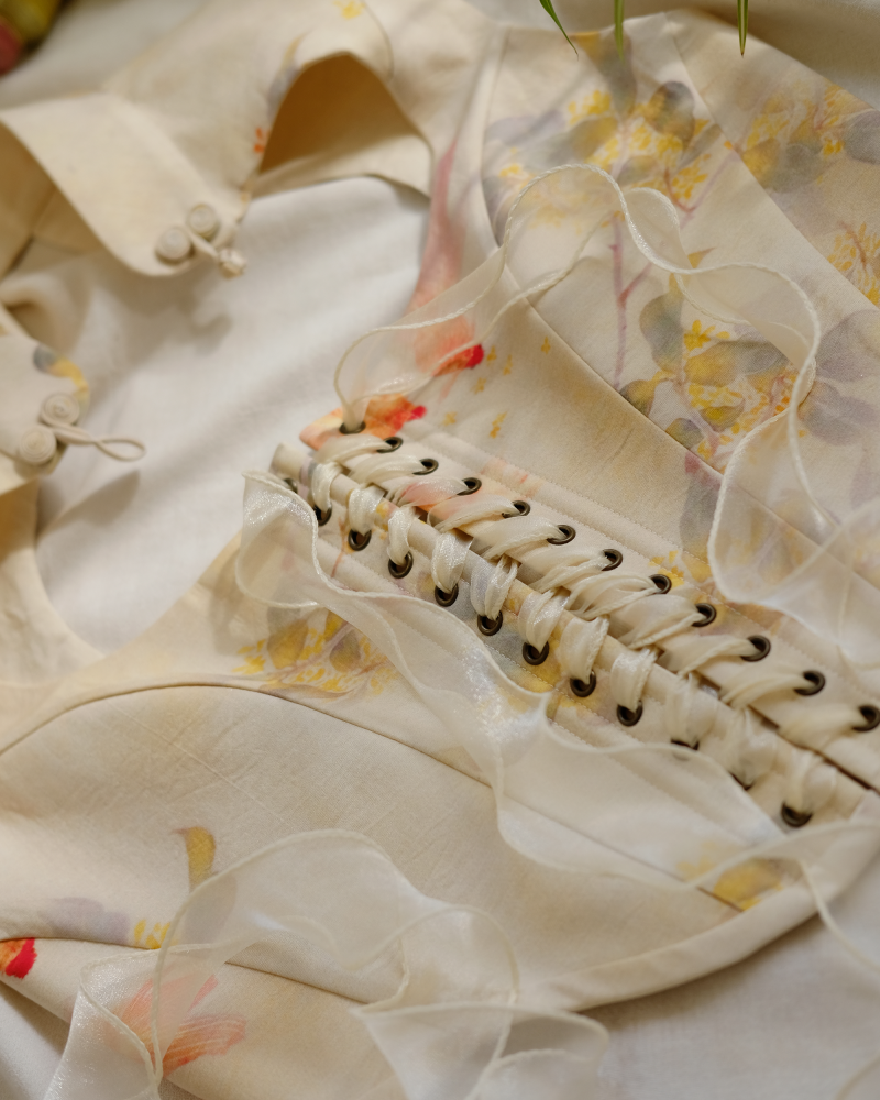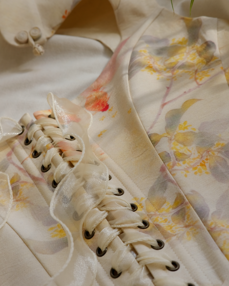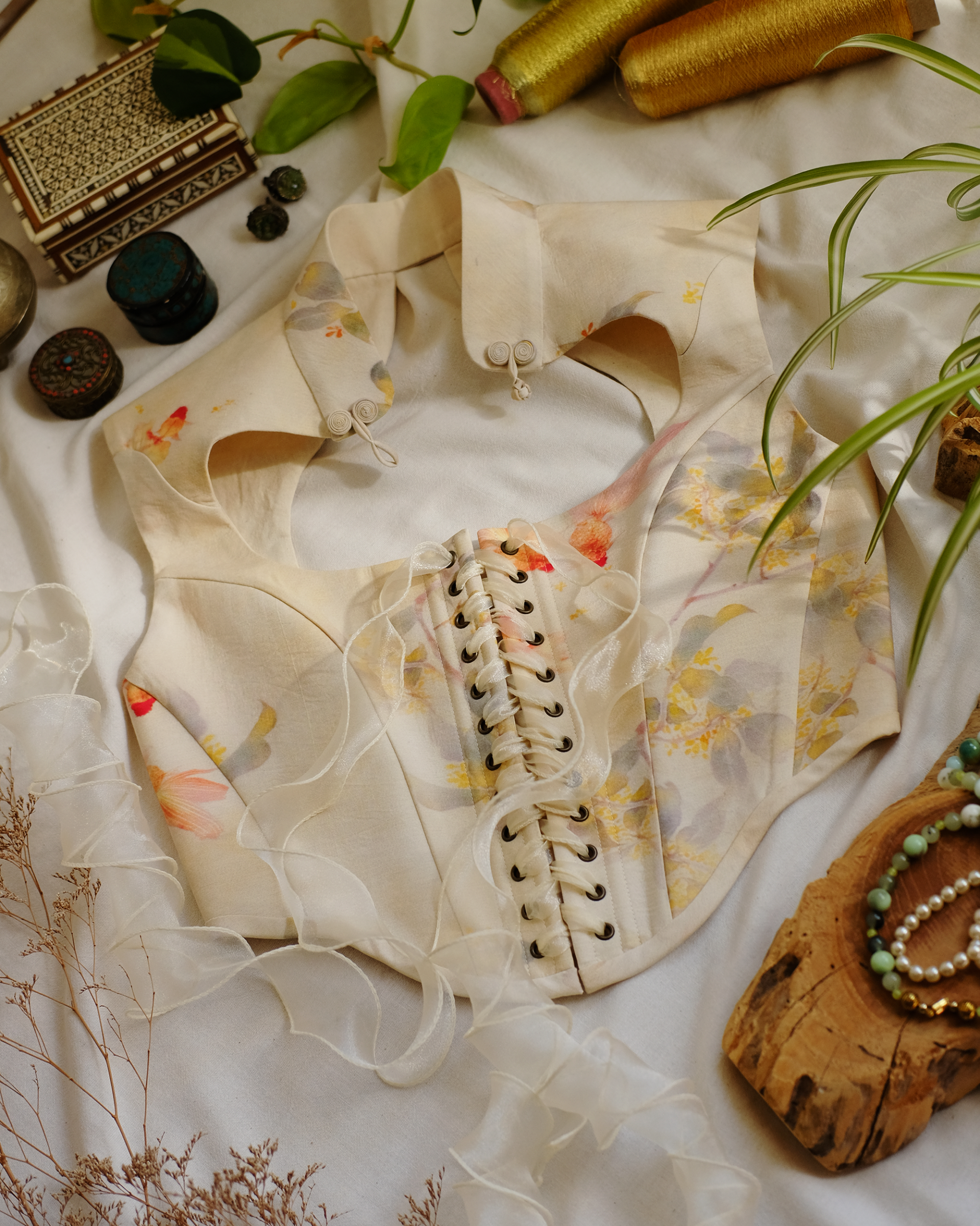 One bespoke corset in the same shape as Duskhoney, made from cream ramie splattered with watercolour goldfish.
