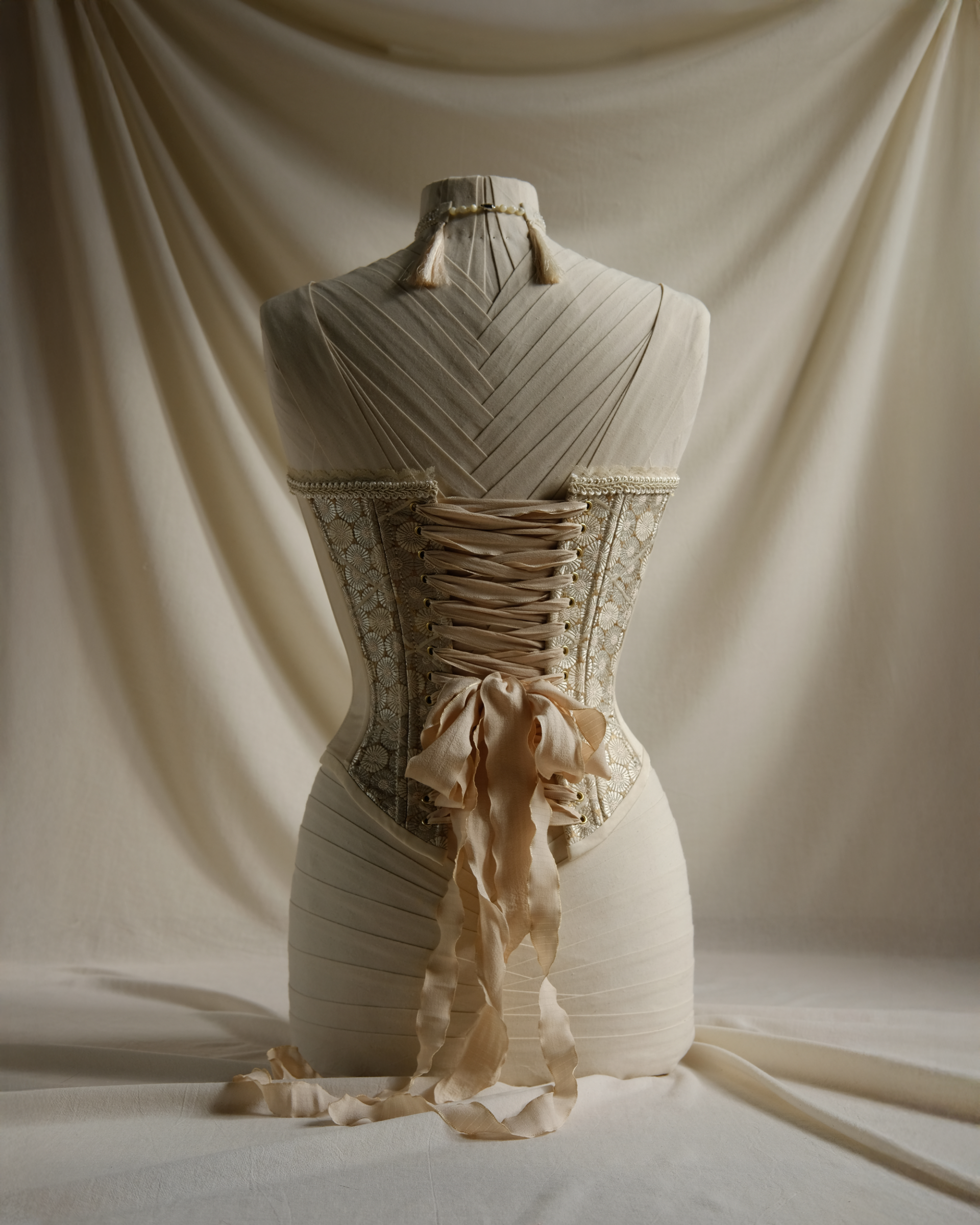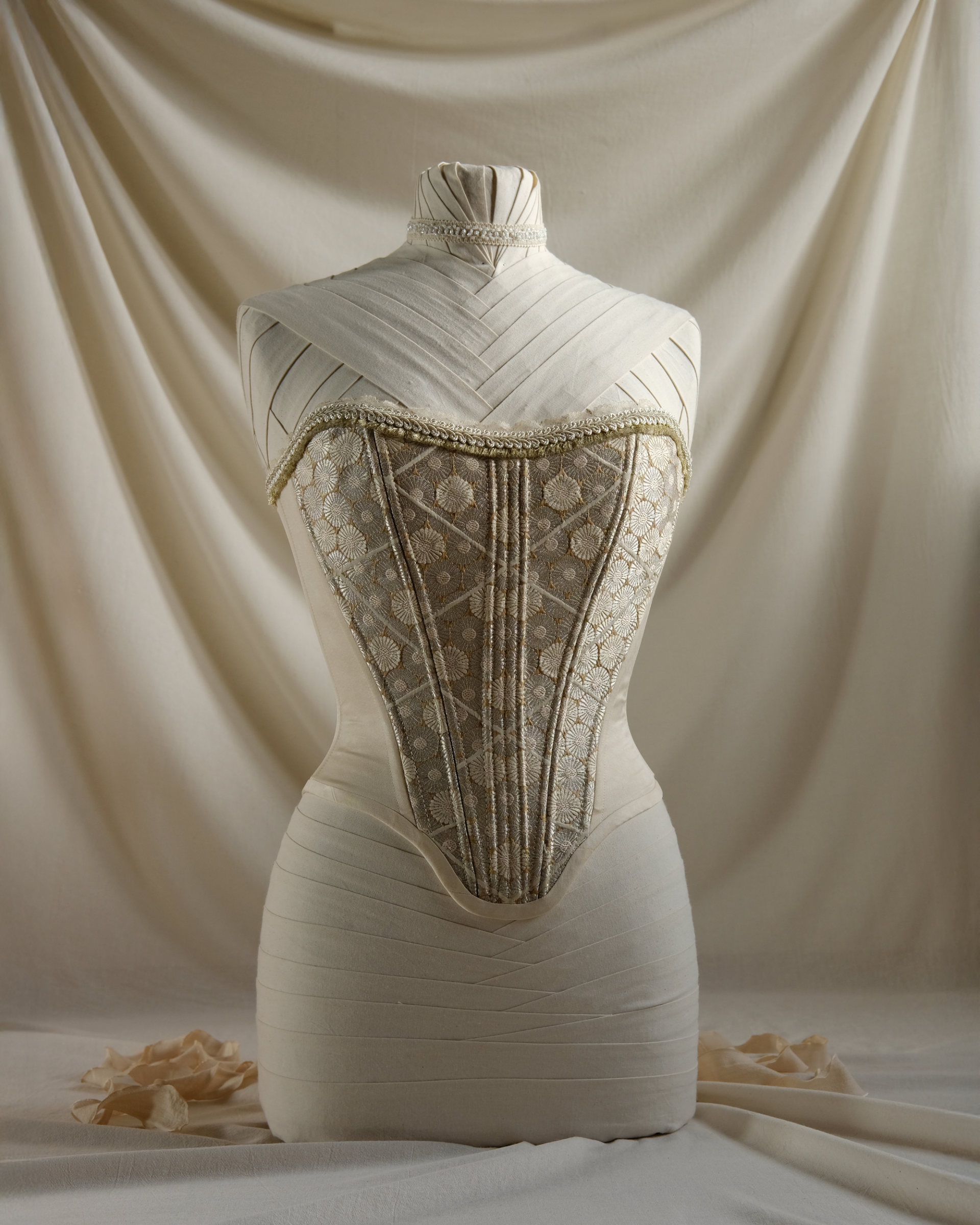 Internal: 11-panel construction reinforced with synthetic whalebone; engineered to lift the chest and cinch the waist by following the natural architecture of the wearer.