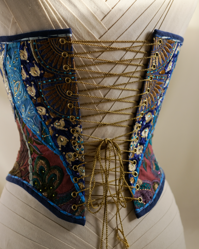 Internal: Fully boned to lift the chest and cinch the waist, following the architecture of the wearer.