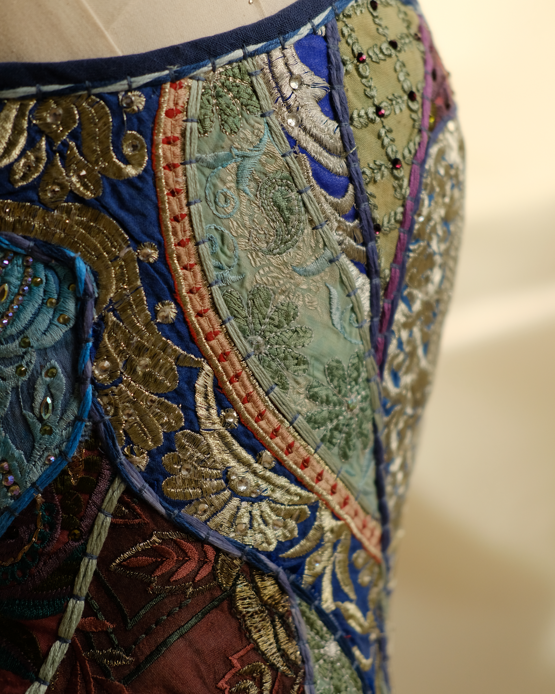Shell: Recycled and restored saree embroidery; a constellation of gold, indigo, and moss-toned fragments overstitched until ruin became a rhythmic pattern.