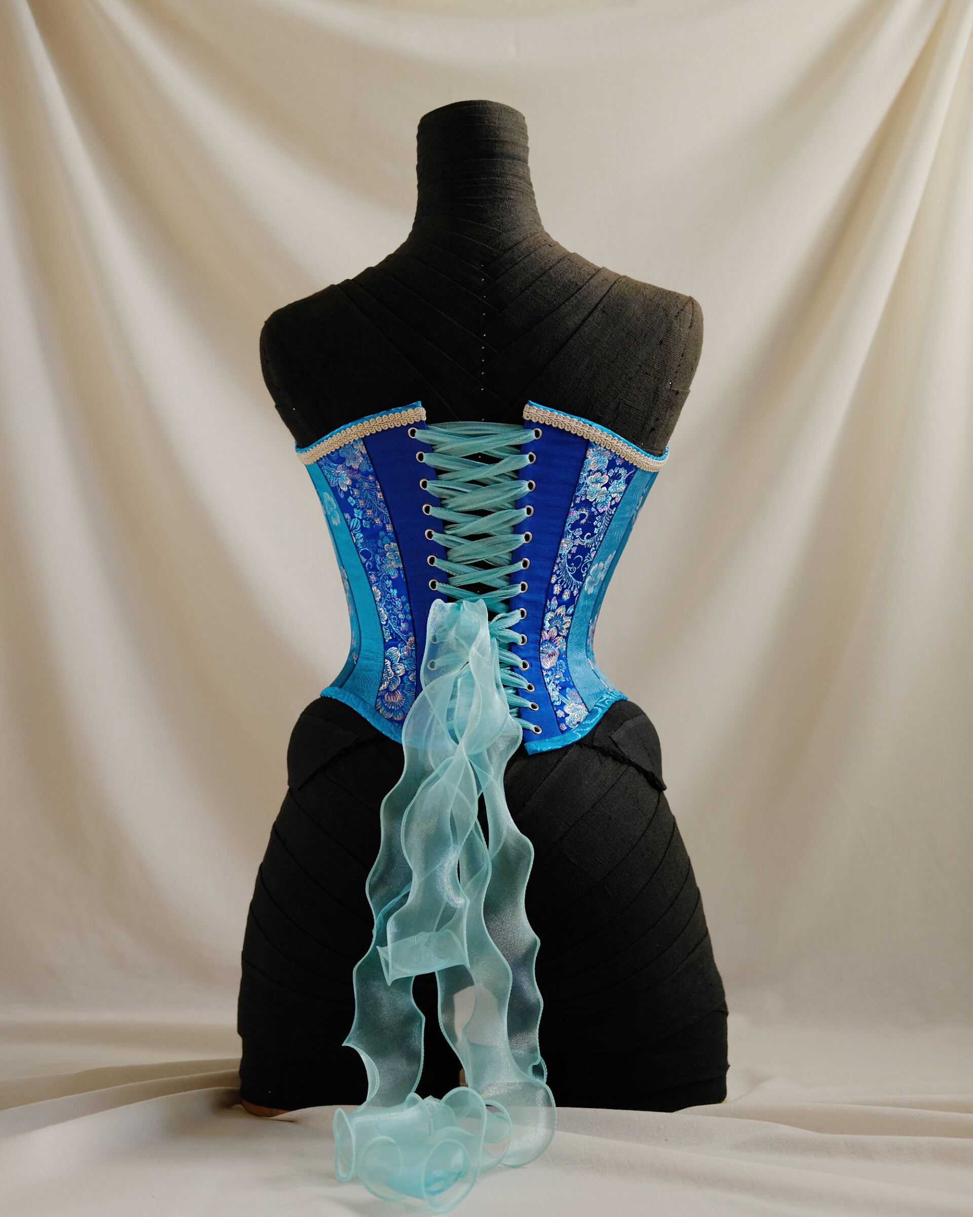 Lacing: Iridescent aqua organza ribbon lacing, trailing into a soft tail in the back. Cream coloured, narrow satin ribbon in the front.