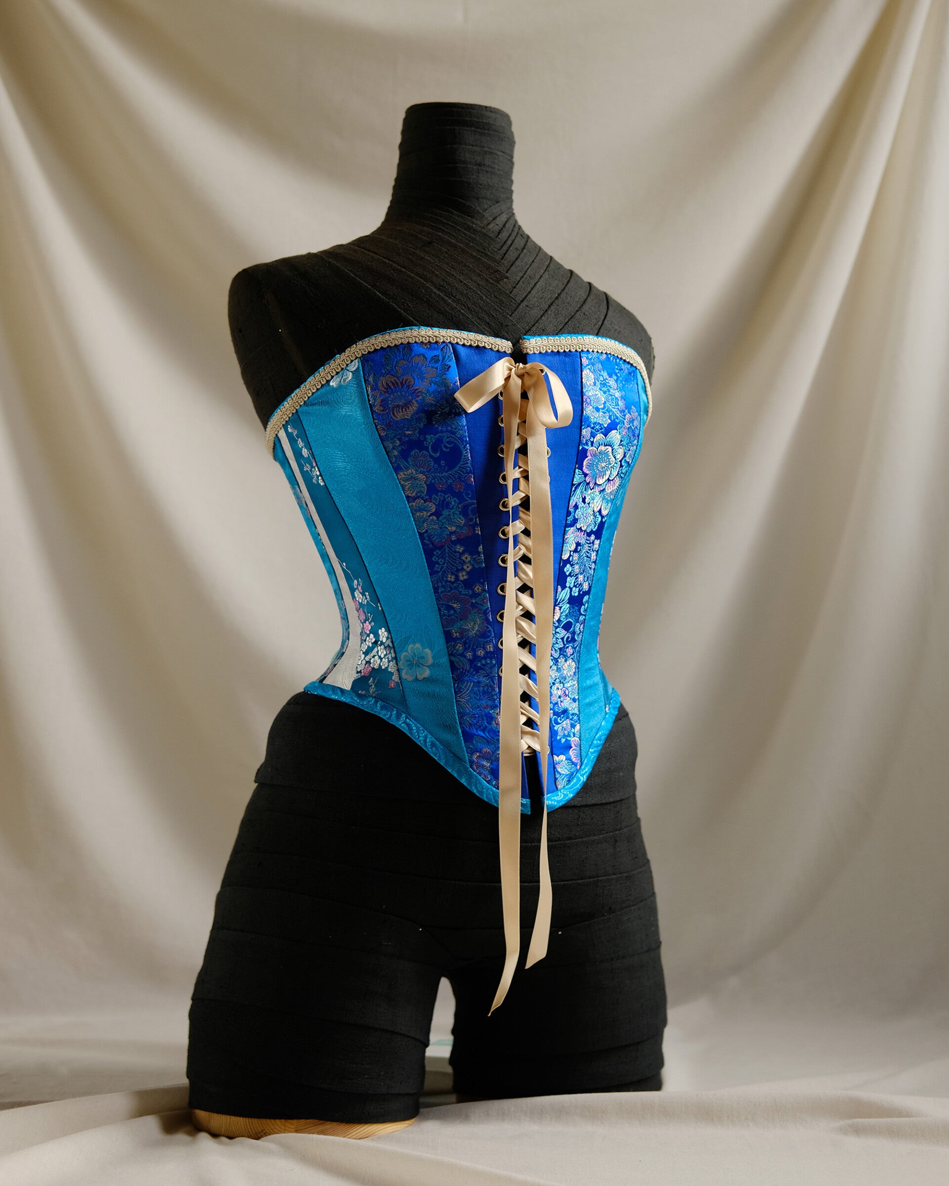 Shell: A mosaic of reclaimed vintage qipao fabrics; a composition of indigo and cerulean silk-synthetics with woven floral motifs.