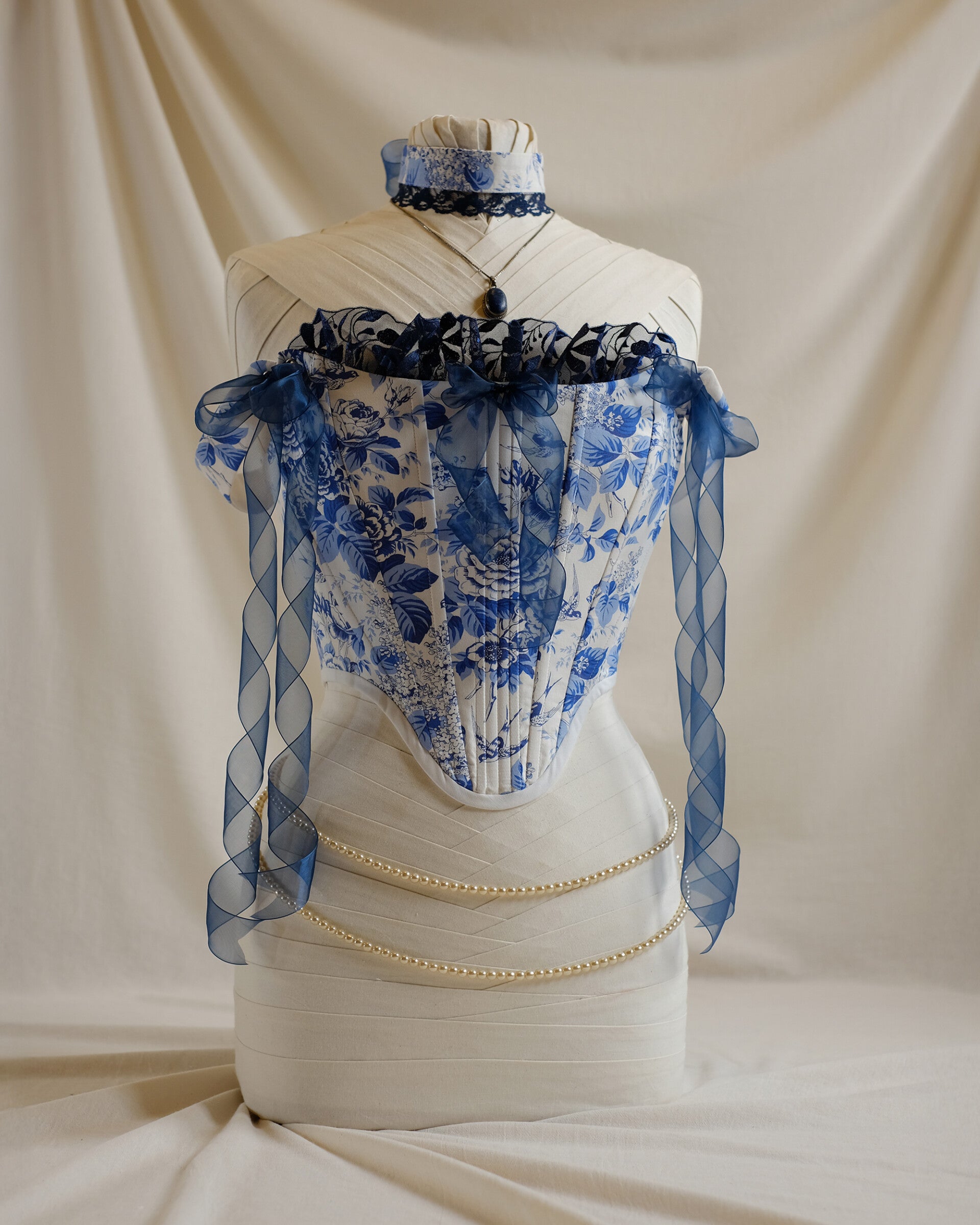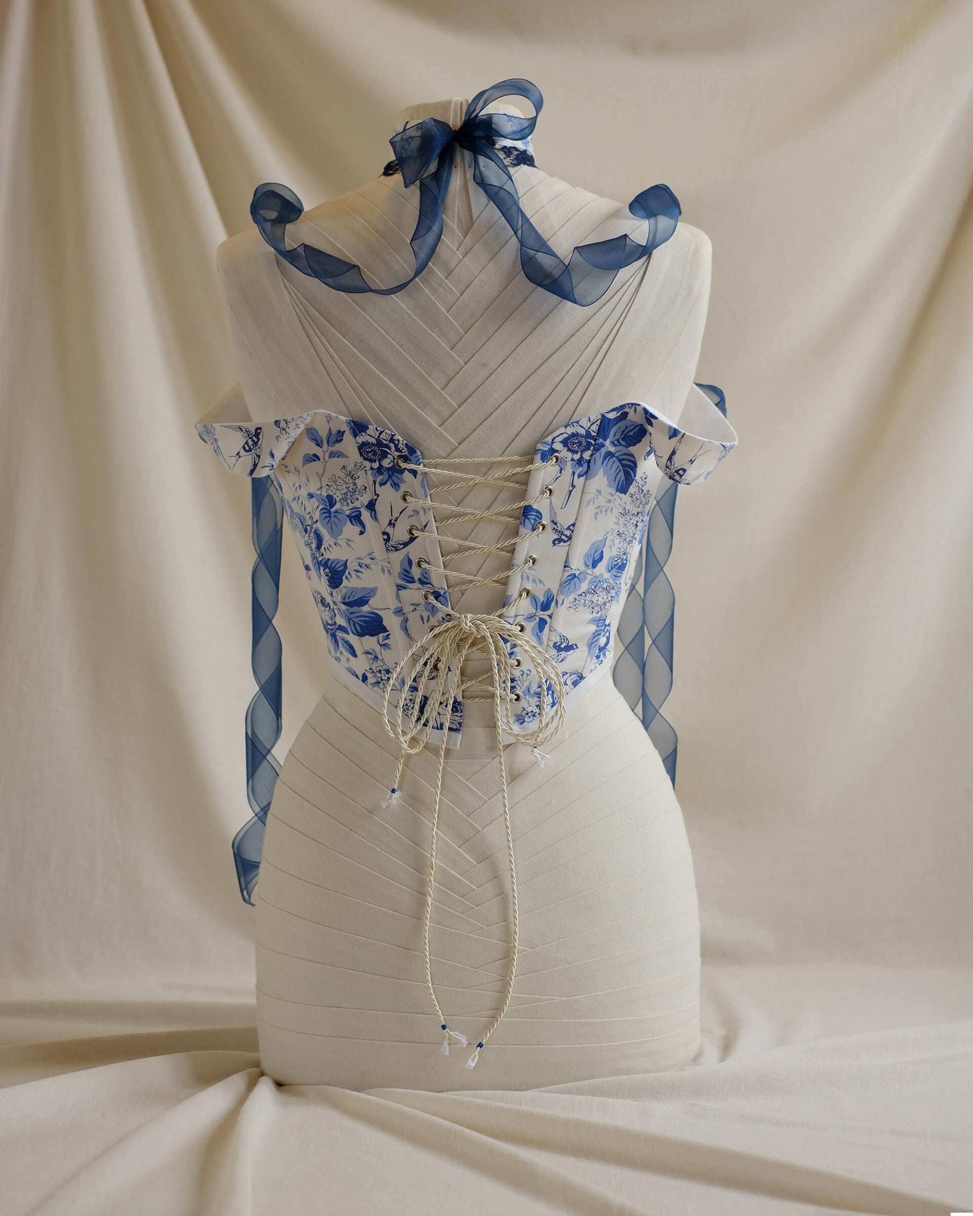 This piece is built for a bust between 84–91 cm. The waist sits comfortably between 64–71 cm depending on your preferred lacing gap and rib tension. The side seam of the garment is 18 cm, but the construction allows it to sit naturally on bodies with a side torso length up to 23 cm.