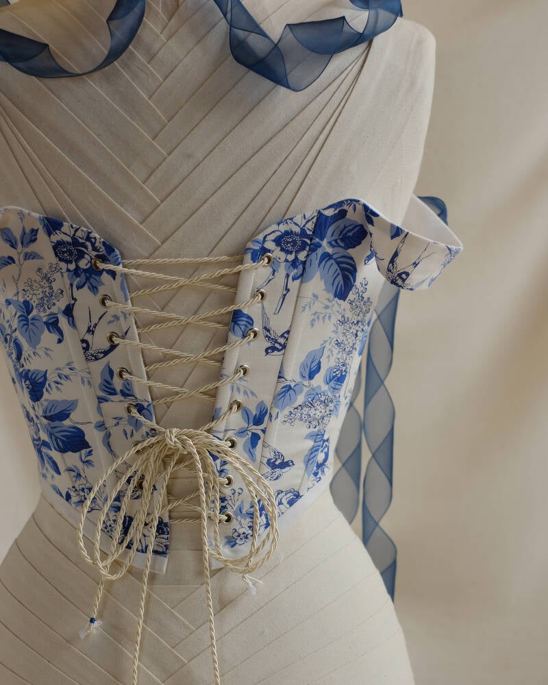 Internal: Precise 11-panel construction reinforced with synthetic whalebone; shaped with a soft pointed hem to elongate the torso.