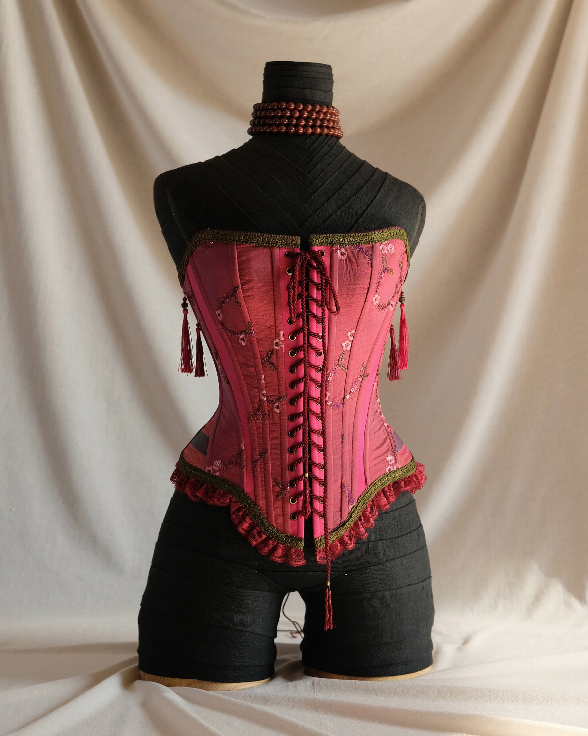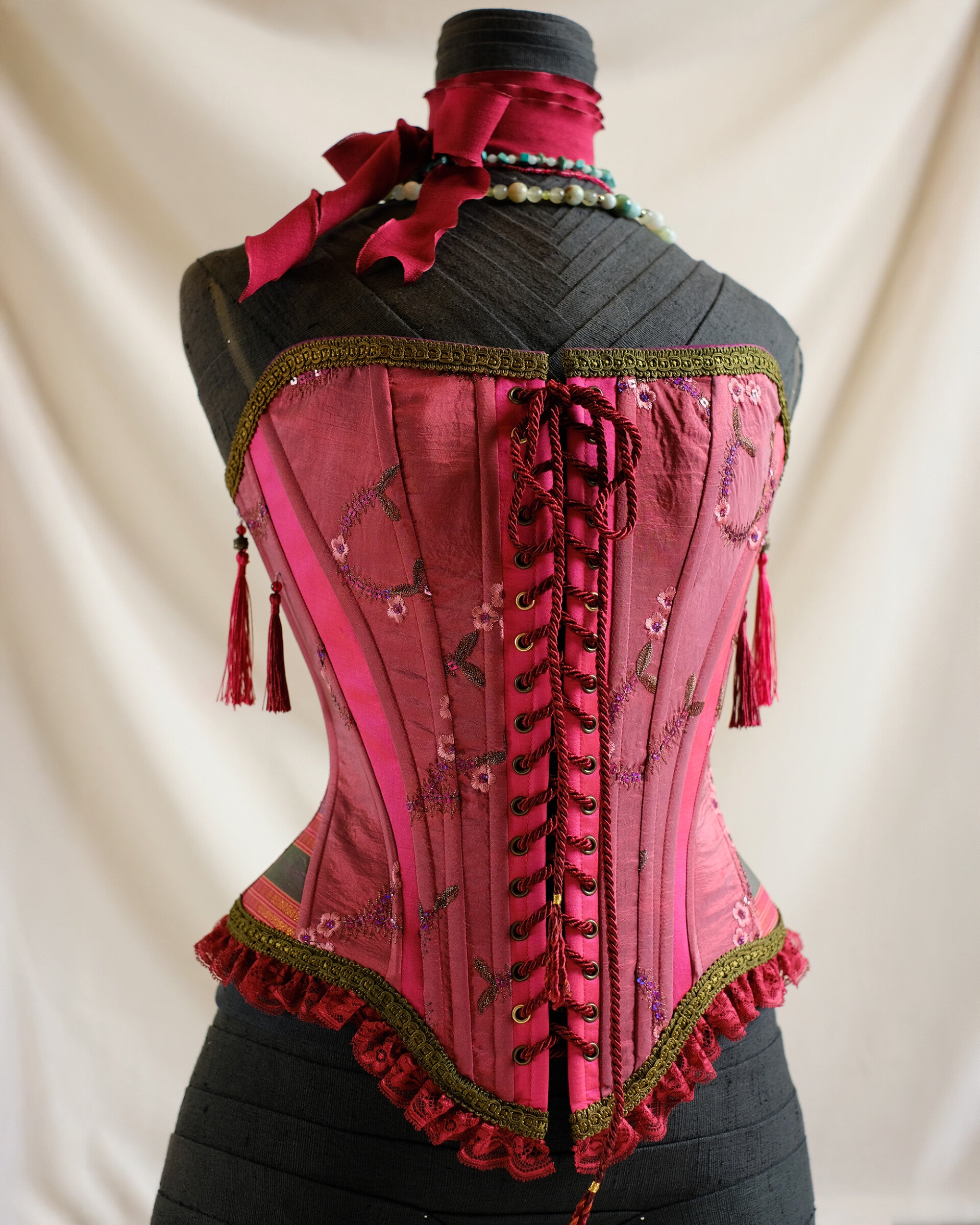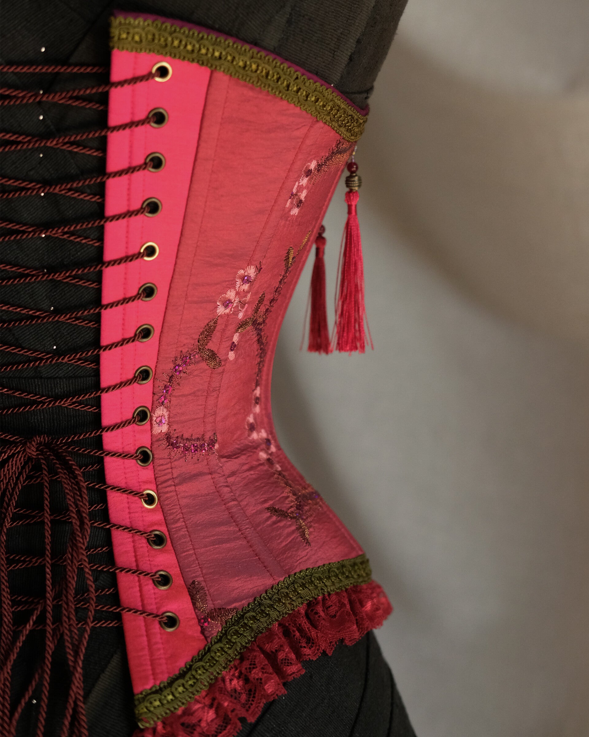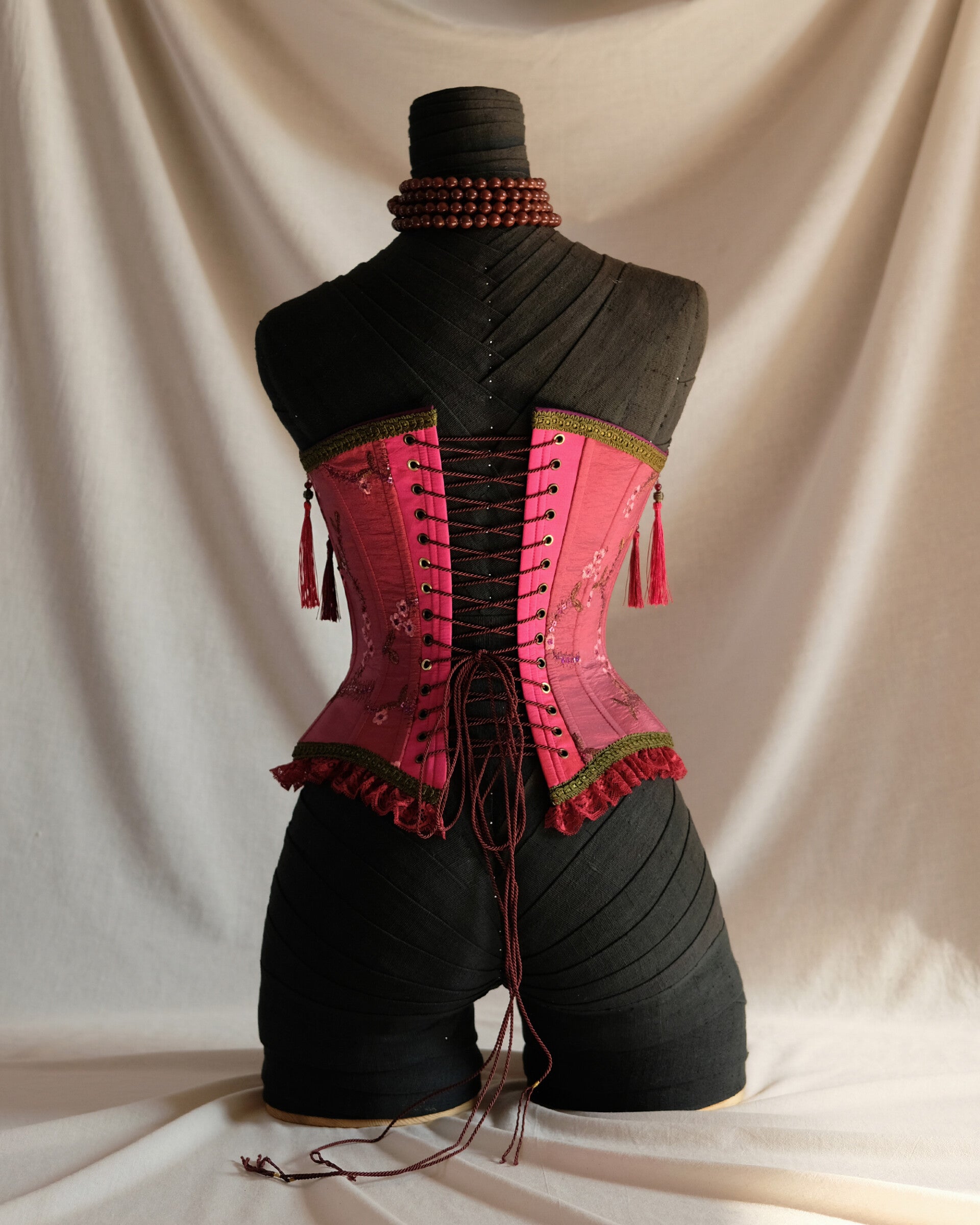 Detailing: Olive-toned trim frames the corset, creating contrast and grounding the warmth of the silk; hand-finished tassels at the sides and hem add controlled movement.